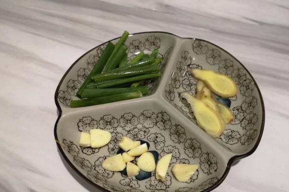 2、鱼处理好后,姜去皮洗净切片,蒜去皮切成小粒,葱洗净切成段备用。