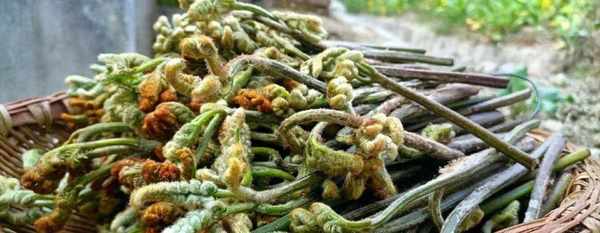 蕨菜的形态很别致,初生时嫩叶成卷曲状,茎细秆高,有棕色细毛,长大后,叶片展开,为三回羽状复叶,越向前端生长越尖。会同蕨菜是在当季取未展开的嫩叶嫩芽部分为食,本地人一般会用腊肉炒食,还可以清炒、凉拌或煮汤,口感滑嫩爽脆。不过,蕨菜含有有害物质原蕨苷,因此吃前一定得先焯熟。