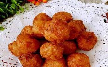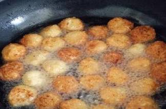 6.热锅凉油,油温6成热,下入丸子中火炸制金黄色即可。