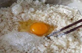 4.挤去多余的水分,加入面粉,打入鸡蛋,加入少许盐,鸡精,五香粉,搅拌均匀。