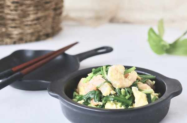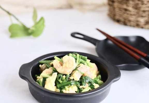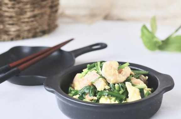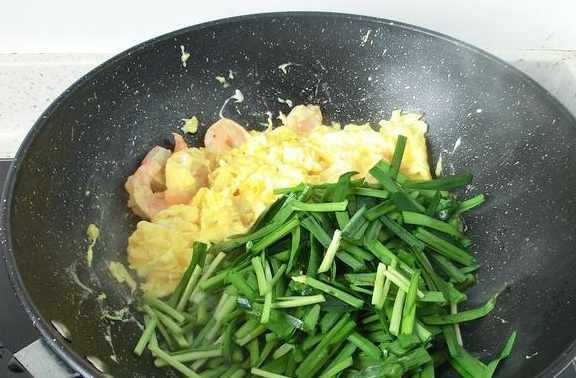 食材:韭菜250克,蝦仁30克,雞蛋3個