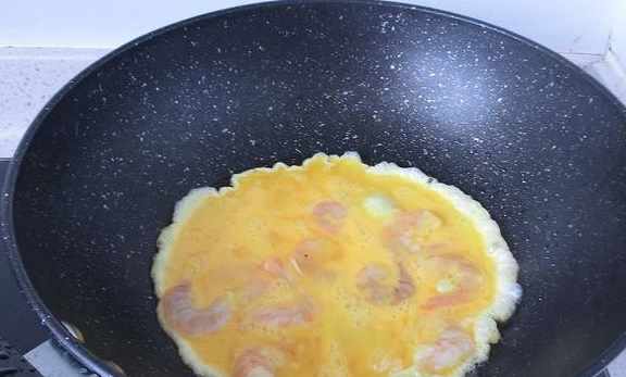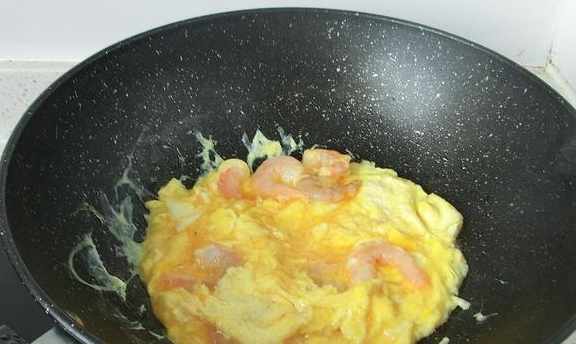 5、炒鍋倒油熱,下蝦仁翻炒。