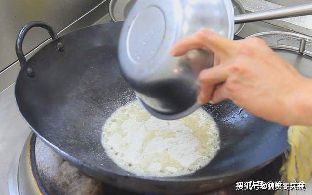 现在,我们做一点“面油”勾汤用,锅内烧油,油温三成热时,倒入面粉,迅速用勺子快速搅动,让油和面粉快速融合,然后起锅倒出“面油”,放置收汤汁用。
