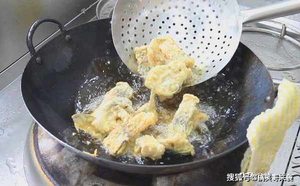 下面,我们把鱼块过油炸一下,锅内烧油,油温五成热时,依次放入鱼块,有粘连在一起的用勺子轻轻打散,中小火炸制五分钟左右,等到鱼块炸至金黄,倒出鱼块控油备用。
