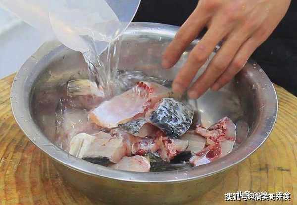 首先我们准备一下食材,处理过的草鱼一条,切去鱼头,沿鱼脊骨片成两半,分别剁成三厘米左右的小块,鱼头也斩开,破成两半,放在盆里清洗干净。