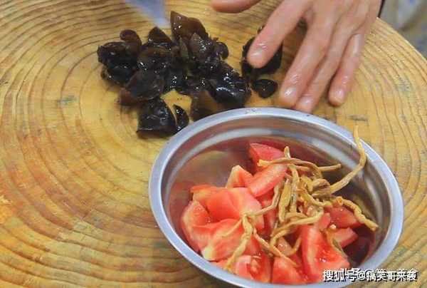 翻炒出香味以后,倒入番茄、黄花菜和木耳继续翻炒,加入酱油5克,加入酱油提一下鲜味,放入料酒3克,放入料酒去一下鱼的腥味,然后加入适量的清水。