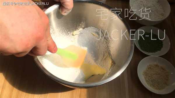 4、筛入低筋面粉110克、杏仁粉10克、抹茶粉6克,继续用刮刀压拌均匀、拌至颜色均匀成团即可。