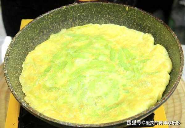 取出平底锅烧热,加入半勺植物油,热油充分滑锅后倒出,淋入少许凉油,加入几滴芝麻油增香,油热以后倒入拌好的苦瓜和鸡蛋,晃动锅摊匀,开中火使鸡蛋受热均匀,等鸡蛋慢慢凝固、成型以后翻过来煎另一面,继续煎1分钟左右,把鸡蛋煎至两面金黄即可关火,切成小块,一道简单好吃的苦瓜煎蛋就做好了。