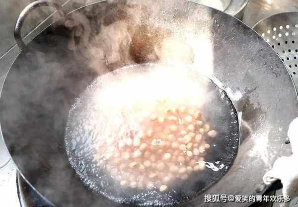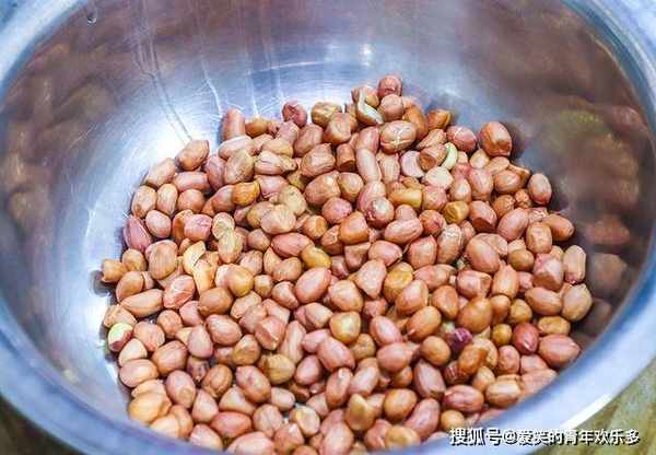 锅中烧水,水烧开以后倒入浸泡过的花生,把花生煮至微微鼓起、表面发亮时倒出来,用清水冲洗,冷却控水,清水冲可以洗保持花生清脆的口感。