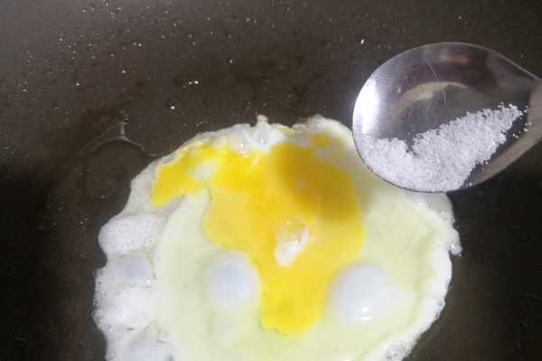 雞蛋磕入鍋裏,蛋黃劃散,加入少許鹽入個底比特,煎到雞蛋底部凝固
