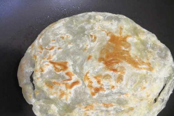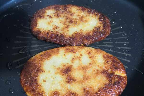 平底鍋加植物油燒熱,放入手抓餅烙制,中途翻面,烙到餅鼓起鏟出備用