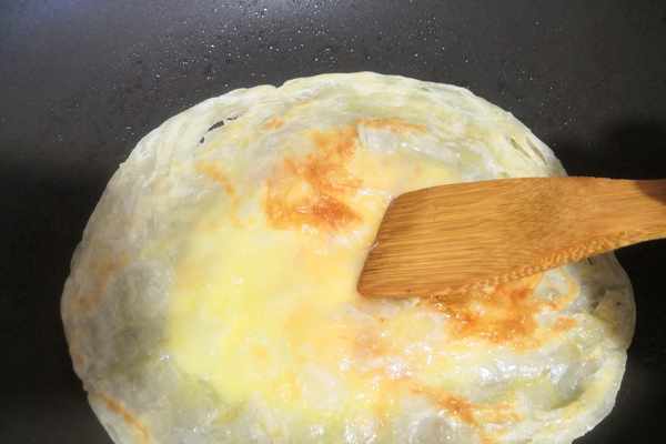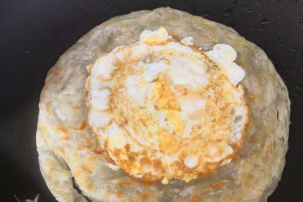 快速把烙好的手抓餅蓋在雞蛋上邊,趁雞蛋表面還沒有凝固,用鏟子按壓至貼牢