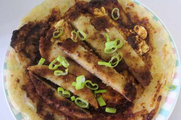 手抓餅鏟出,在雞蛋的一面刷一層蒜蓉辣醬,肉排切成條,再切點蔥花