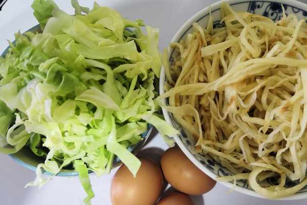 高麗菜雞蛋炒餅絲,用到的食材是高麗菜、大餅絲和雞蛋。餅絲是今早量販店買的現成的,切一大碗高麗菜絲,洗洗控水,先攤雞蛋塊盛出,再蔥花熗鍋,倒入高麗菜絲炒個三兩下,加鹽,再加入生抽醬油,炒勻後關小火,鋪上大餅絲,開中大火蓋上鍋蓋燜,鍋裏菜汁少許,把餅絲和高麗菜炒勻,倒入雞蛋炒到餅絲表面油潤就可以關火了。
