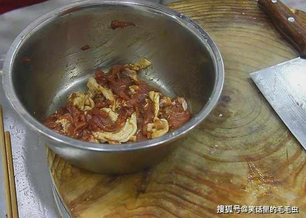 码味,呲进去五毛钱的料酒去腥,顺着一个方向搅打把料汁全打到肉片里面。