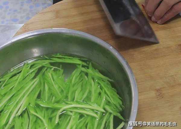 苦瓜瓤是苦味的主要来源,片干净 ,斜刀片成片,切好以后放到凉水里面,浸泡个五六七八分钟。