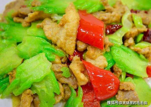 锅内再烧油,倒入葱姜红干椒翻炒出香味来,闻到葱香味的时候,倒入苦瓜和红椒,开大火翻炒,再倒入肉片,起锅淋入料酒。