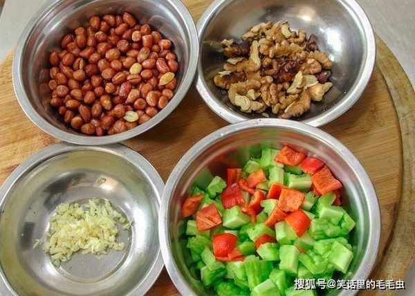 第一步还是要先把苦瓜瓤清洗干净,切成丁。切点红椒片,把核桃仁剥出来。抓一把油炸花生米,切点蒜末。