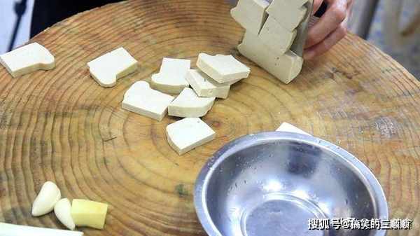 1.首先我们准备一下食材,豆腐200克,从中间切开,切成方片,放在盆里备用。