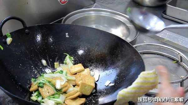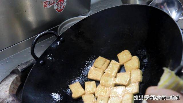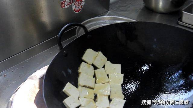 5.加入食盐1克,鸡粉1.5克,十三香1.5克,把所有调料翻炒均匀以后,放入煎好的豆腐继续翻炒几下。
