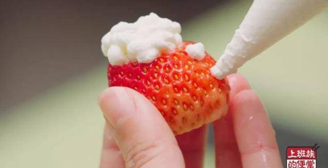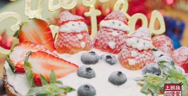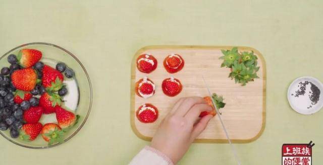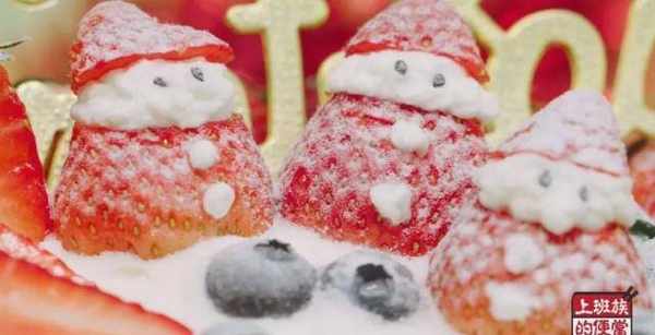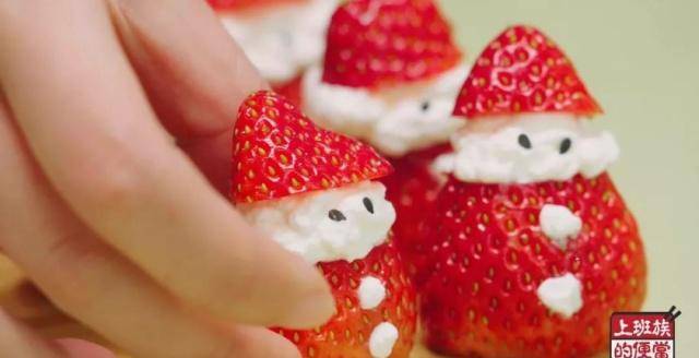 ▲盖上草莓尖,最后点上两颗黑芝麻做眼睛,可爱的圣诞草莓人就做好了,多做几个用来做装饰;