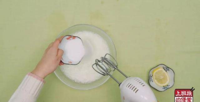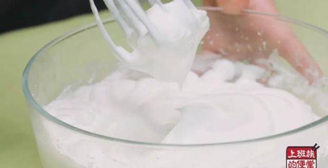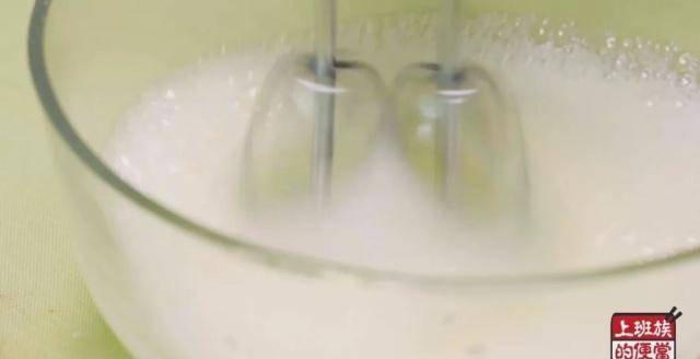 ▲用高速档打至硬性发泡,提起打蛋器有小弯钩就差不多了;