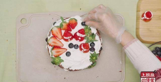 然后放上草莓小人,草莓片、蓝莓以及草莓蒂做装饰,摆成你喜欢的样子即可,蛋糕的中间也可以塞上几颗蓝莓做装饰