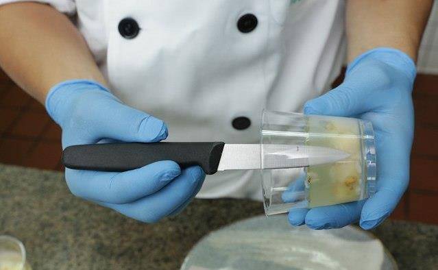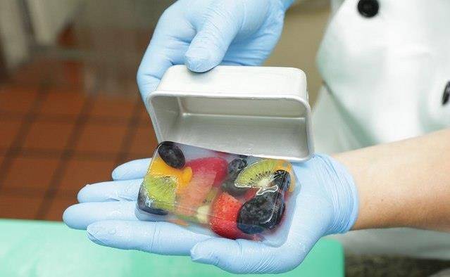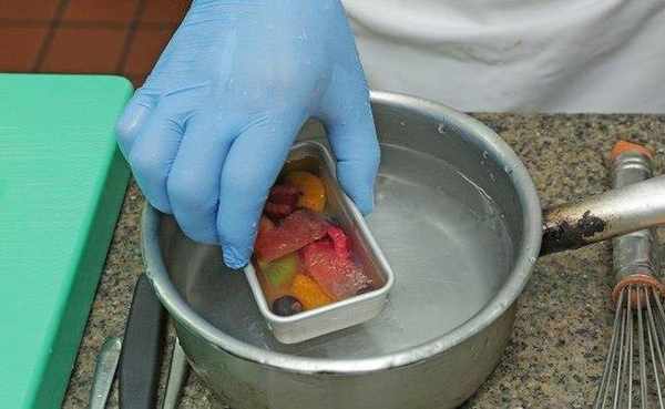 冻类最伤脑筋的就是脱模时受损,主厨蔡鸿宾表示,可分为塑胶膜和金属膜,2种不同的脱模方式,塑胶膜可用小刀将冻体和膜稍微分开,即可轻松脱模;而金属模则是在脱模前,先将冻品连模泡入约摄氏50度的温水中,让冻类边缘稍微溶解后,就可以完整并迅速脱模。