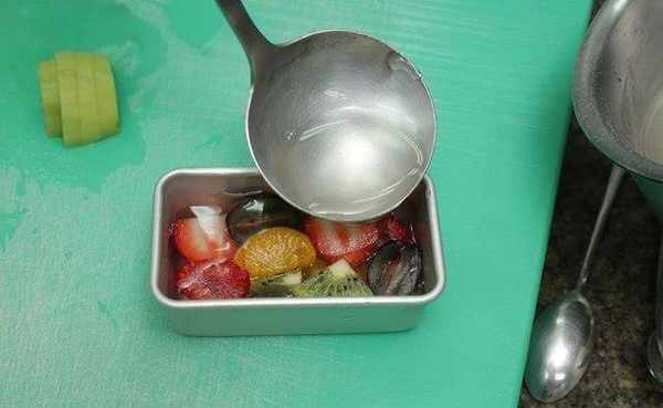 Tips:分次倒入,可让寒天糖水完全包覆水果,并且保持果冻本身透亮。建议不要选择口感软烂的水果,吃来容易没有层次感。