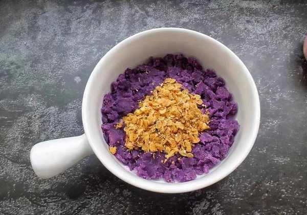 紫薯软烂后我们放到碗中用勺子进行碾压成泥状,然后在加入肉松燕麦与紫薯泥搅拌均匀。