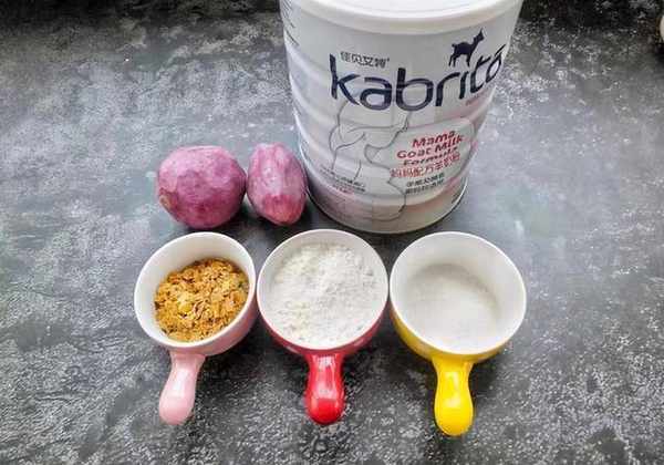 食材:糯米粉100克、紫薯泥300克、燕麦20克、奶粉30克、细砂糖20克、清水少量