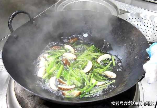 锅内烧水,加入食盐3克,接近水开时把香菇倒进去,水烧开以后放入芹菜一起焯水,芹菜断生以后放入红椒丝稍微烫一下,一起倒出控水备用。