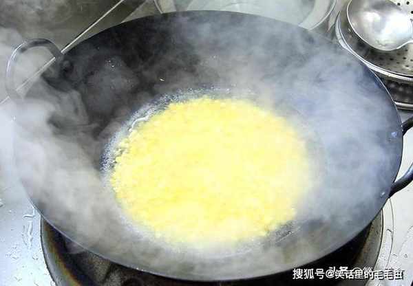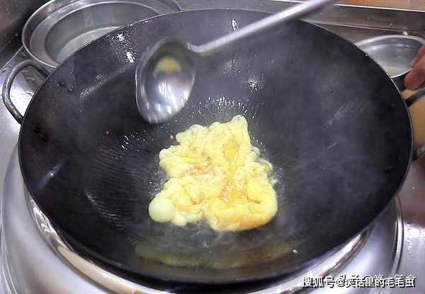 把锅烧热,加入植物油滑锅,油温六成热时,把蛋液倒入锅中,蛋液会迅速膨胀定型,随便翻炒几下就熟了,倒出来备用。