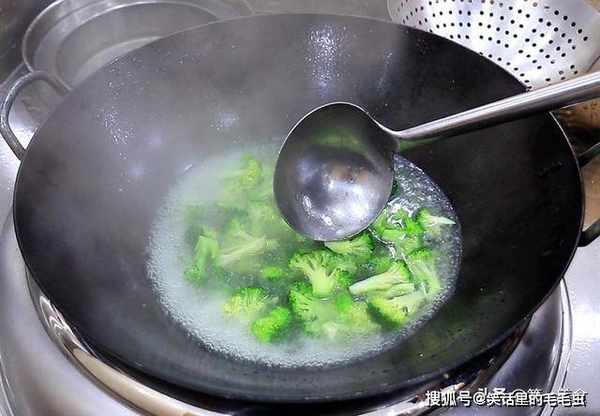 锅内烧水,水烧开以后倒入西兰花,快速焯水30秒钟,西兰花断生返青以后,倒出来用清水冲洗降温,这样吃起来更加清脆。
