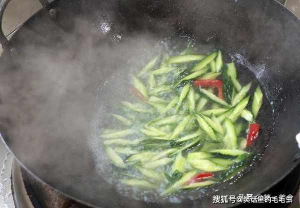 锅内烧水,加入少许食盐入底味,水烧开以后,倒入黄瓜和红椒,焯水1分钟左右,黄瓜返青后倒出来,用清水冲洗,冷却控水备用。黄瓜焯水能够减少炒制时间,保留黄瓜的水分,使口感更加清脆。