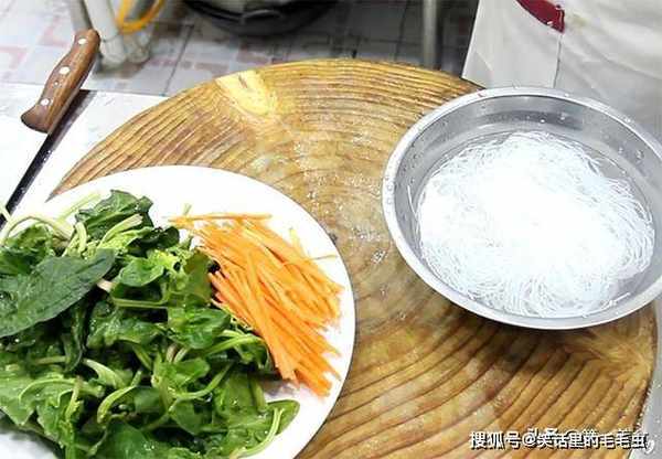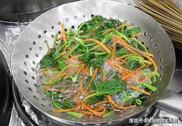 锅内烧水,加入一勺食盐入低味,水烧开以后,先倒入胡萝卜焯烫20秒,胡萝卜比较难熟,要早一点放,再依次倒入菠菜和粉丝,继续焯水20秒,焯水还能去除菠菜中的草酸,倒出后用凉开水冲洗降温,以免粉丝粘在一起。