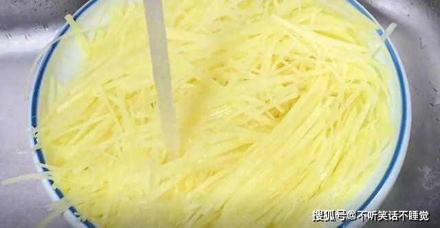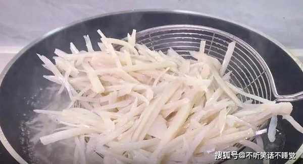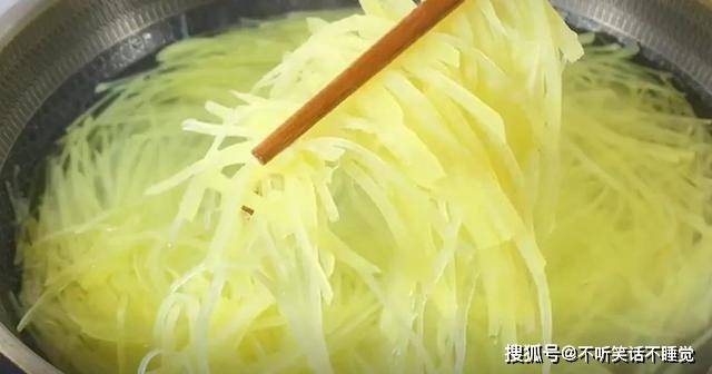 4、接着烧开热水,倒入土豆丝,焯水1分钟捞起。