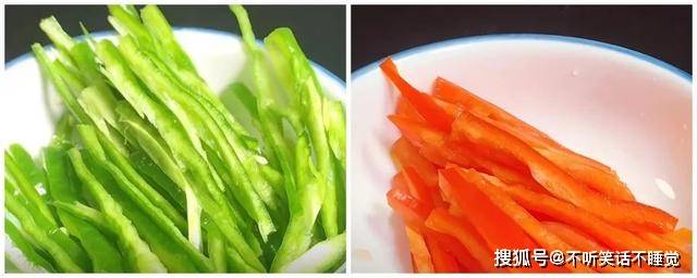 3、随后准备切丝的青红甜椒,选择甜椒就不会辣。