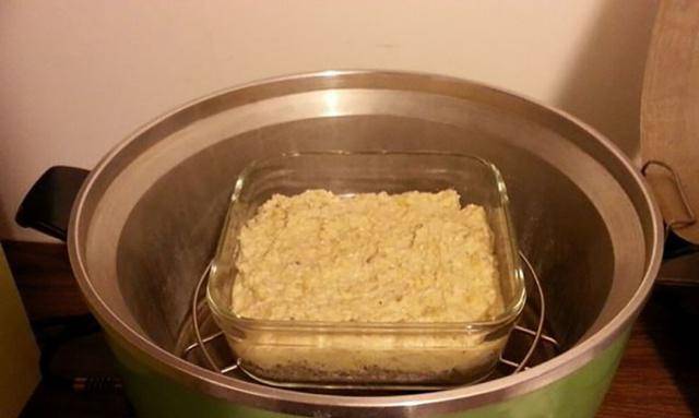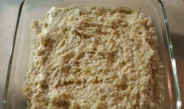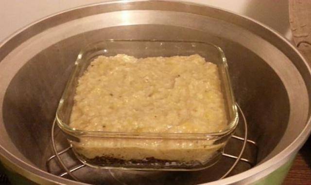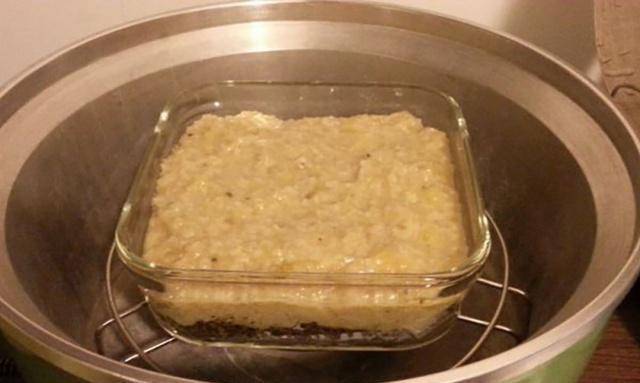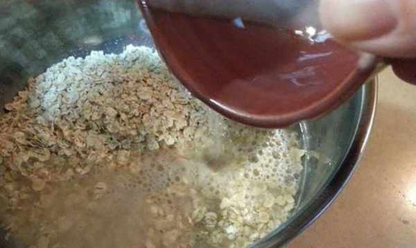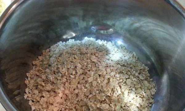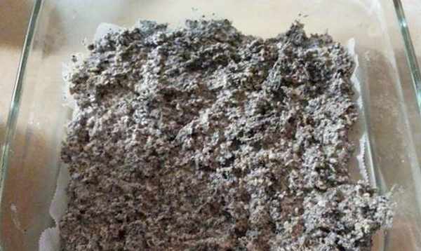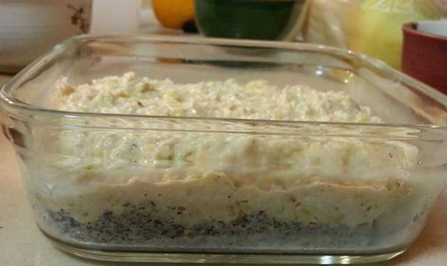倒入刚刚搅拌好的芝麻燕麦糊,用汤匙铺平。