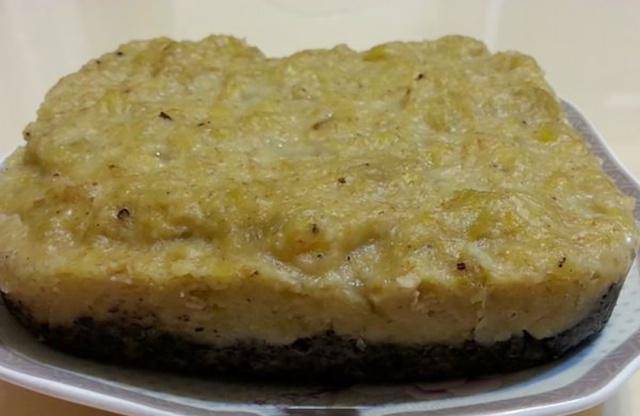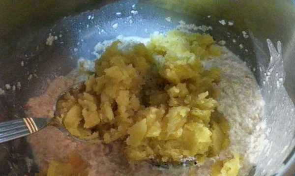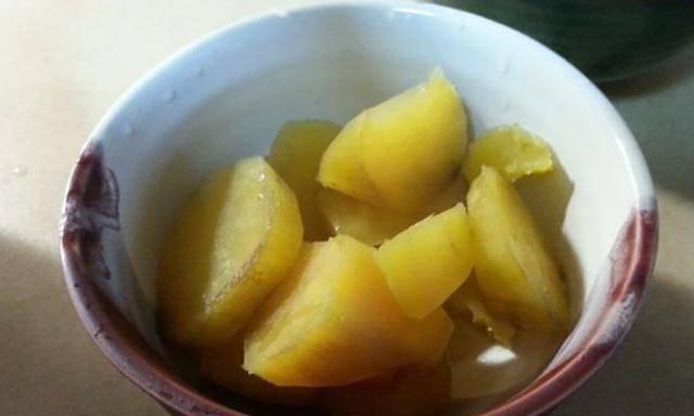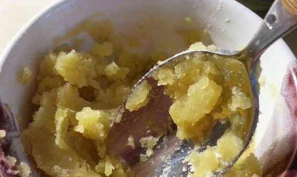 地瓜蒸熟后,趁热用汤匙压成泥。