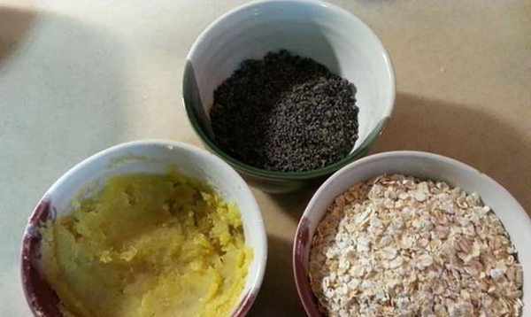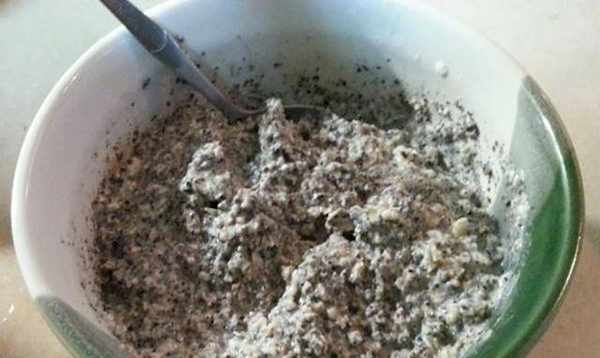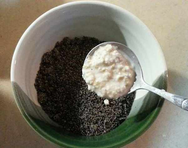 舀起一半的燕麦糊,和芝麻粉混合均匀。