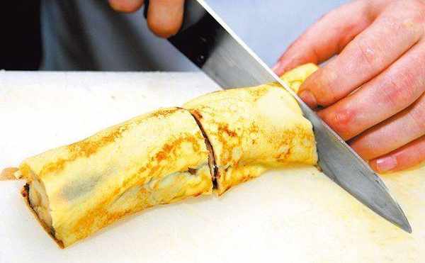 在饼皮中间抹上榛果巧克力酱,摆上切成一段段的香蕉、撒上椰丝卷起。