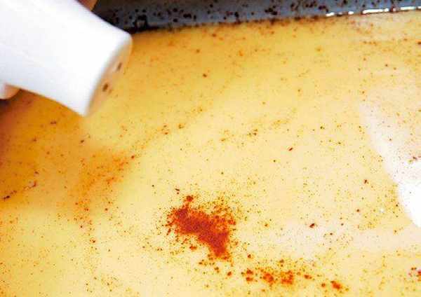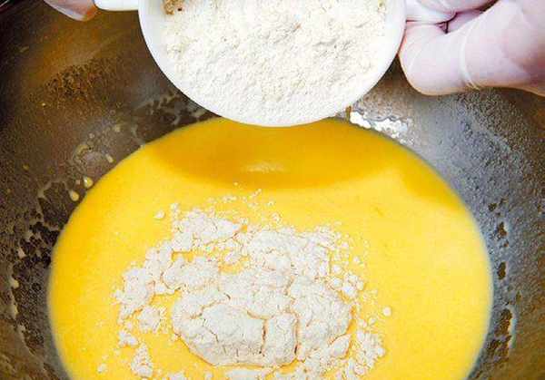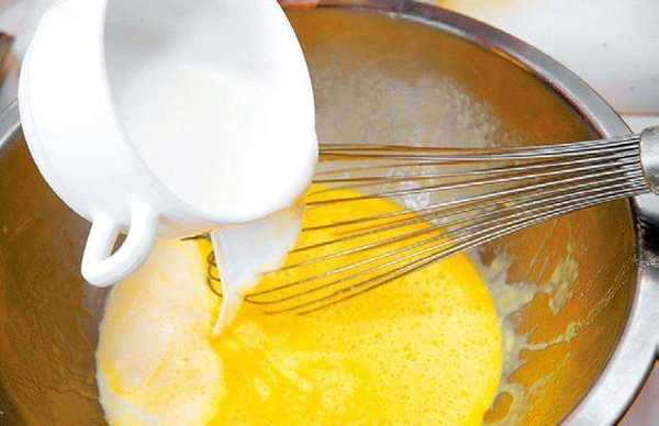 首先将奶油加热、融化,打入鸡蛋、加入鲜奶搅拌均匀。