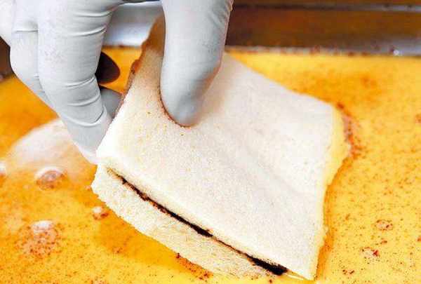 盖上另一片不涂酱的土司,表面均匀沾裹上蛋汁。