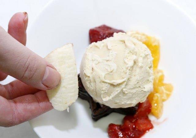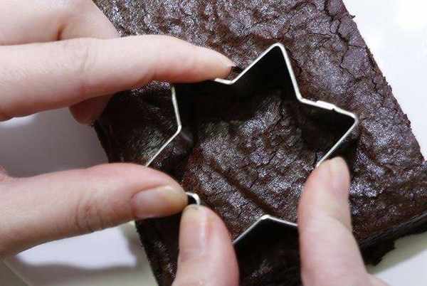 用模具将巧克力布朗尼压出星形,送进微波炉加热1分钟后,挖一球咖啡冰淇淋置于蛋糕上。