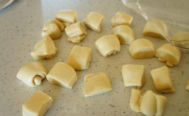 揉好后用擀面棍压成大片,三折,再重复,一直到面团光滑