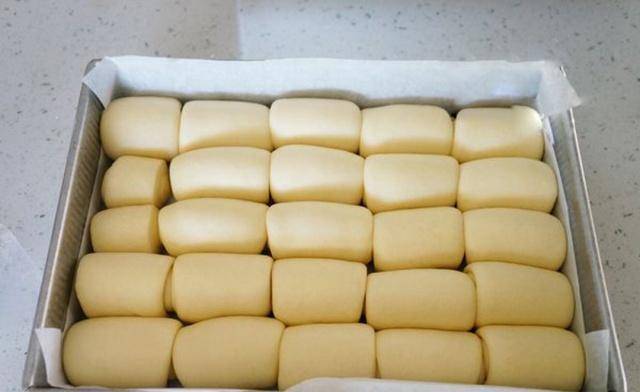 7.把整形好的小面团摆入烤盘中,我的烤盘尺寸为长32公分*宽22公分高5.6公分