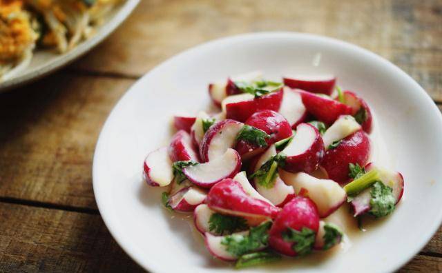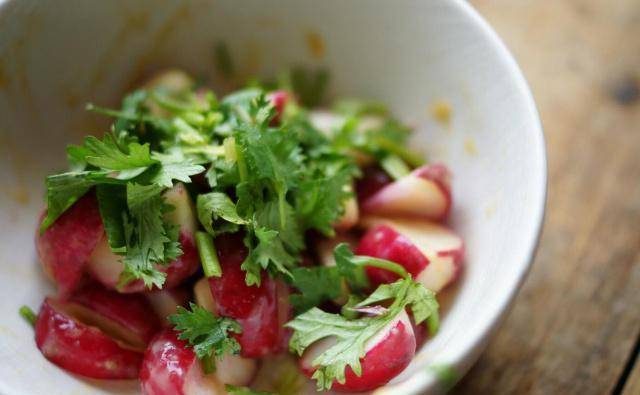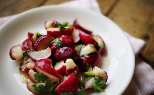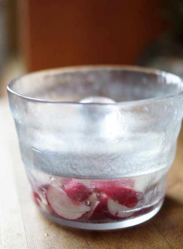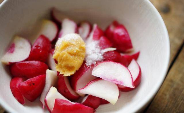 将樱桃萝卜切成四等份,放入浅渍钵加入海盐拌匀,放室温1小时后会出水、变软,接着用冷开水冲洗去除盐分,再沥干水份
