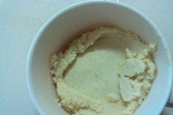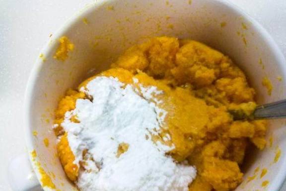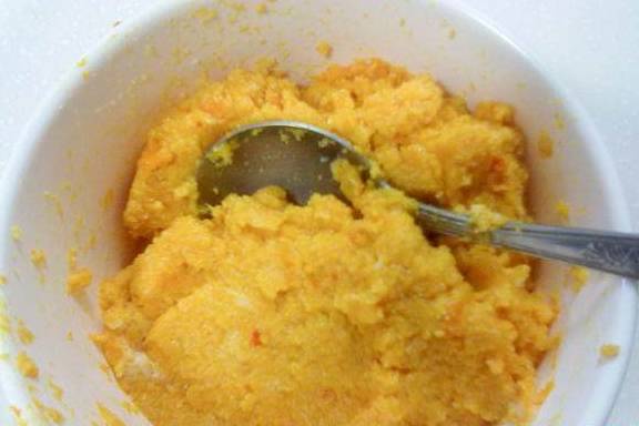 3.南瓜等凉一点的时候,用勺子将南瓜挖出来放到一个碗里,再捣碎成泥。