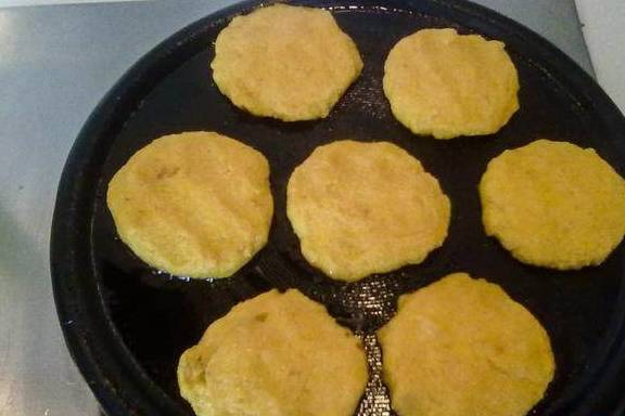 6.将豆渣拿一小勺放到手上压成小圆形,逐个放入烧热的锅内。
